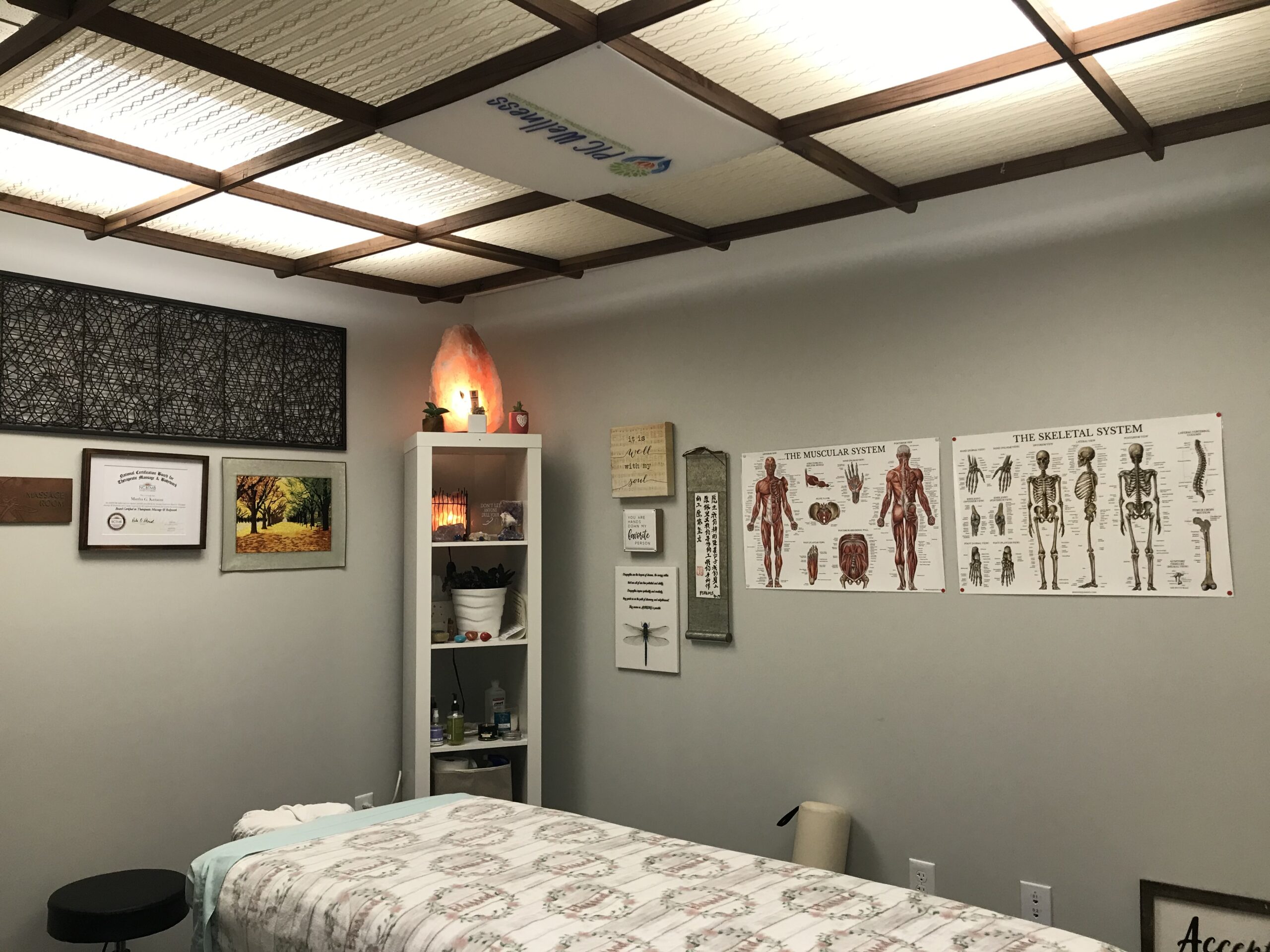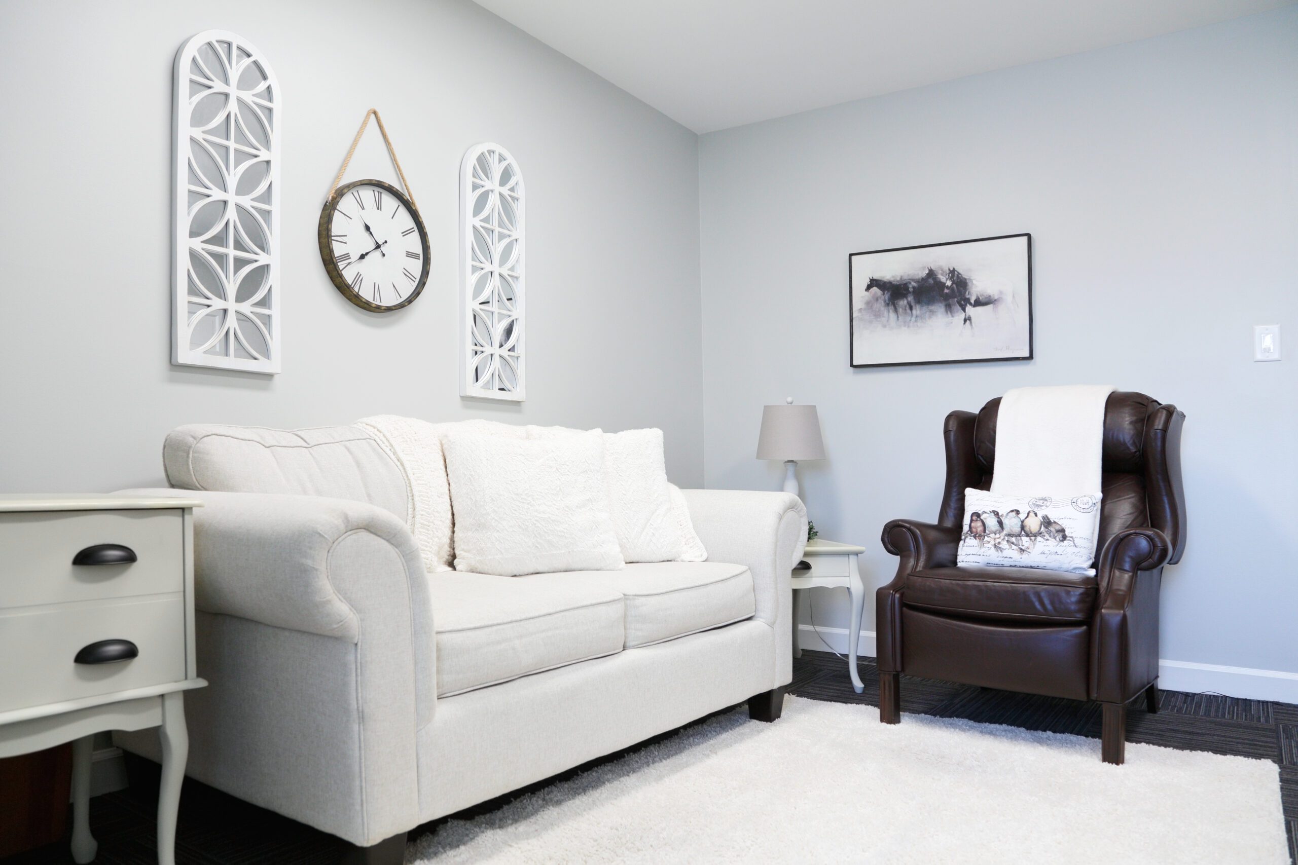 The number one question we get asked is what can be hung on the walls in an office at Office Ours. You may hang posters, pictures, signs, art, etc., on the walls in your new office using nails and anchors. Tape, command strips, or anything sticky can cause damage to the walls and is not allowed. Consider hanging informational or educational materials related to the services you offer, like the tenant below.